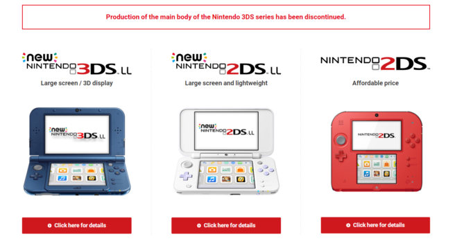 This has been released via a message on their Japanese site that roughly translates to “the production of the main body has been discontinued.” Upon checking the listing for all the models of the 3DS and 2DS (XL, *New*, etc.) a message pops up on all of them that translates to “all have been discontinued.”