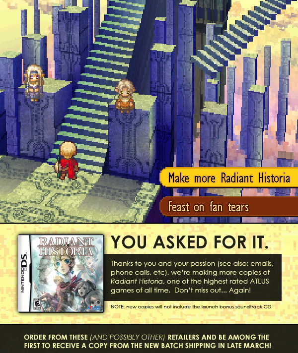 Atlus just dropped off this email confirming a reprint for Radiant Historia. If you have a 3DS or a DS, you won’t want to miss out on this game again. It’s been a hit among critics/fans, and prices for it have been as much as $100 or more.