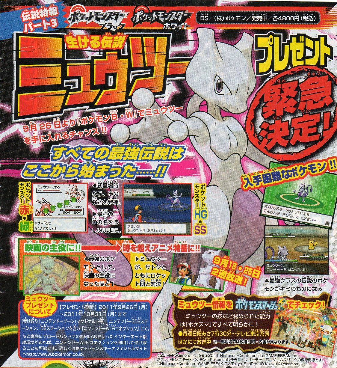 According to the latest issue of CoroCoro, Mewtwo will be distributed for release in Japan. Pokemon Black/White owners should connect online at any time from September 26 to October 31 to receive the Pokemon. Thus far, it has been confirmed that Mewtwo will have its Pressure ability.