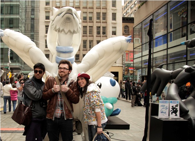In this photo provided by Nintendo of America, Anwar B., 19, from Baltimore, Austen W., 19, from Jacksonville, Florida, and Lauren V., 25, from Cold Spring, New York, pose with larger-than-life inflatable Pokémon from the Pokémon Black Version and Pokémon White Version video games for the Nintendo DS family of systems at the games’ launch event in New York on March 5, 2011. (Nintendo of America)