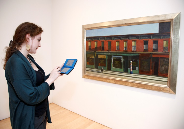 In this photo provided by Nintendo of America, Kira G. of Brooklyn, NY, creates art using Art Academy in front of Edward Hopper’s, “Early Sunday Morning” (1930), at the Whitney Museum of American Art in New York on Oct. 19, 2010. The portable art-training software for the Nintendo DS family of systems launches Oct. 25 and provides players with tools to create their own artwork and to learn real-life art skills. (Anders Krusberg for Nintendo of America)