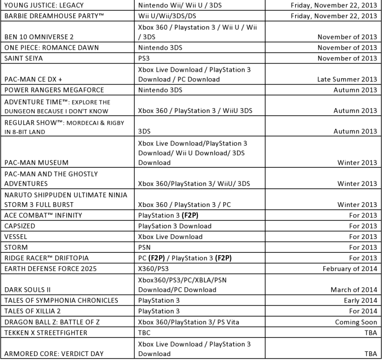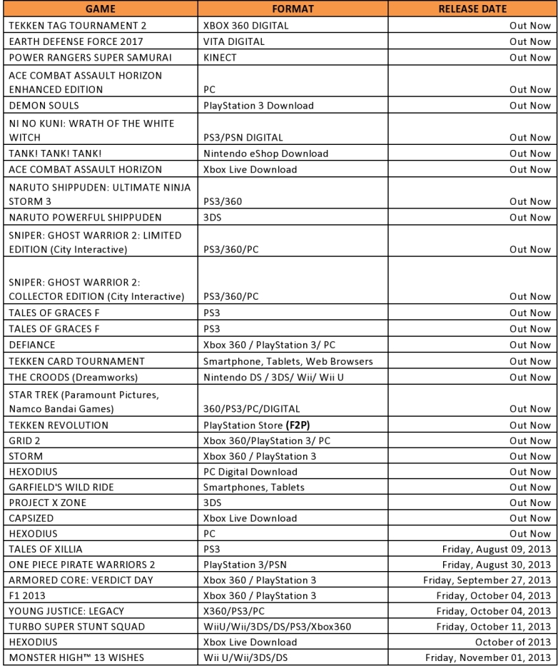 Namco Bandai has sent out a new schedule confirming release dates for upcoming titles. You can find the full lineup in the graphic above.