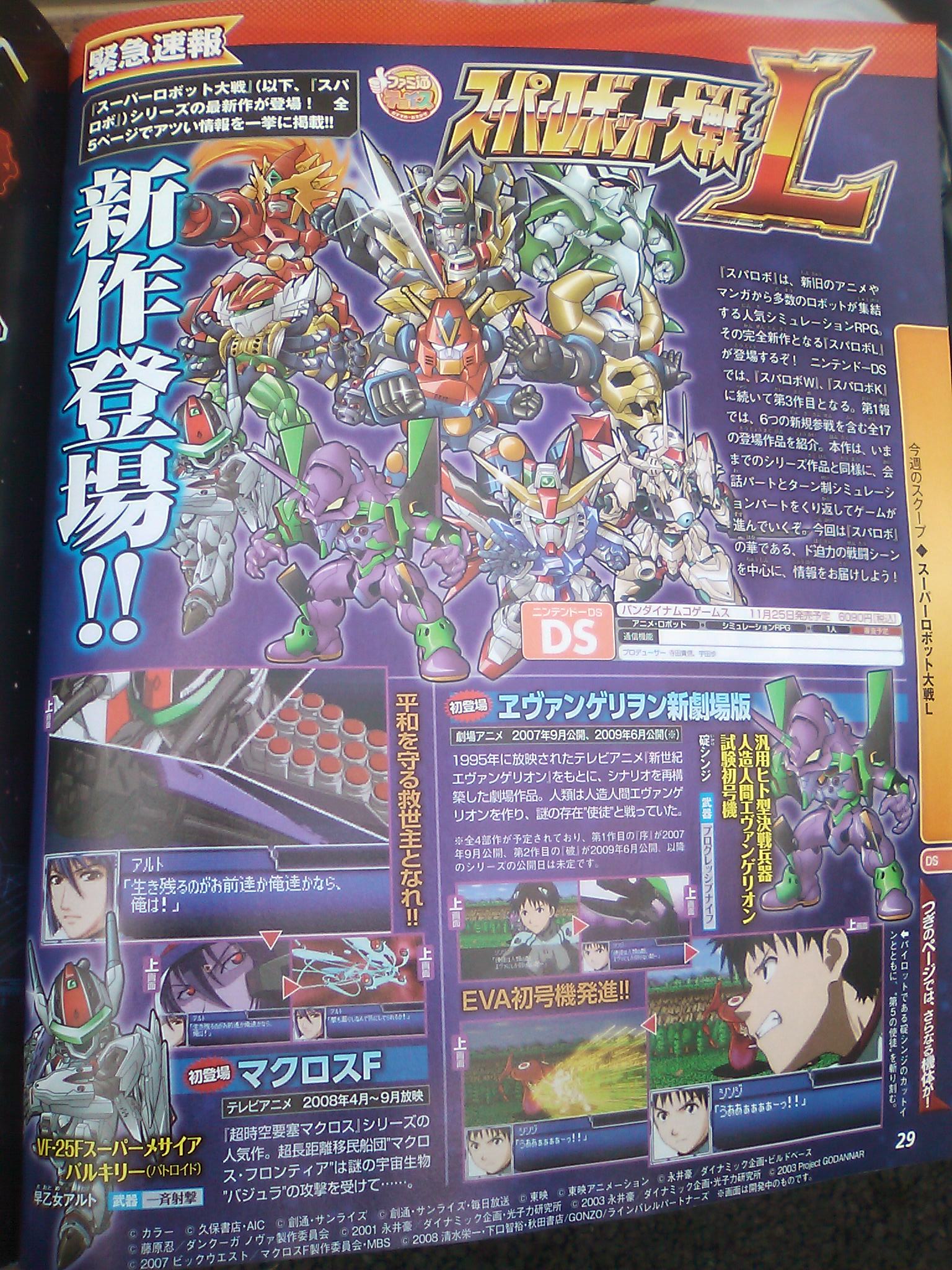 Shiren 5 isn’t the only game that has been announced in this week’s Famitsu. The magazine has also revealed Super Robot Taisen L. Like the past few titles in the franchise, the entry title is in development for DS. You can check out the first scans and a few details about the game below.