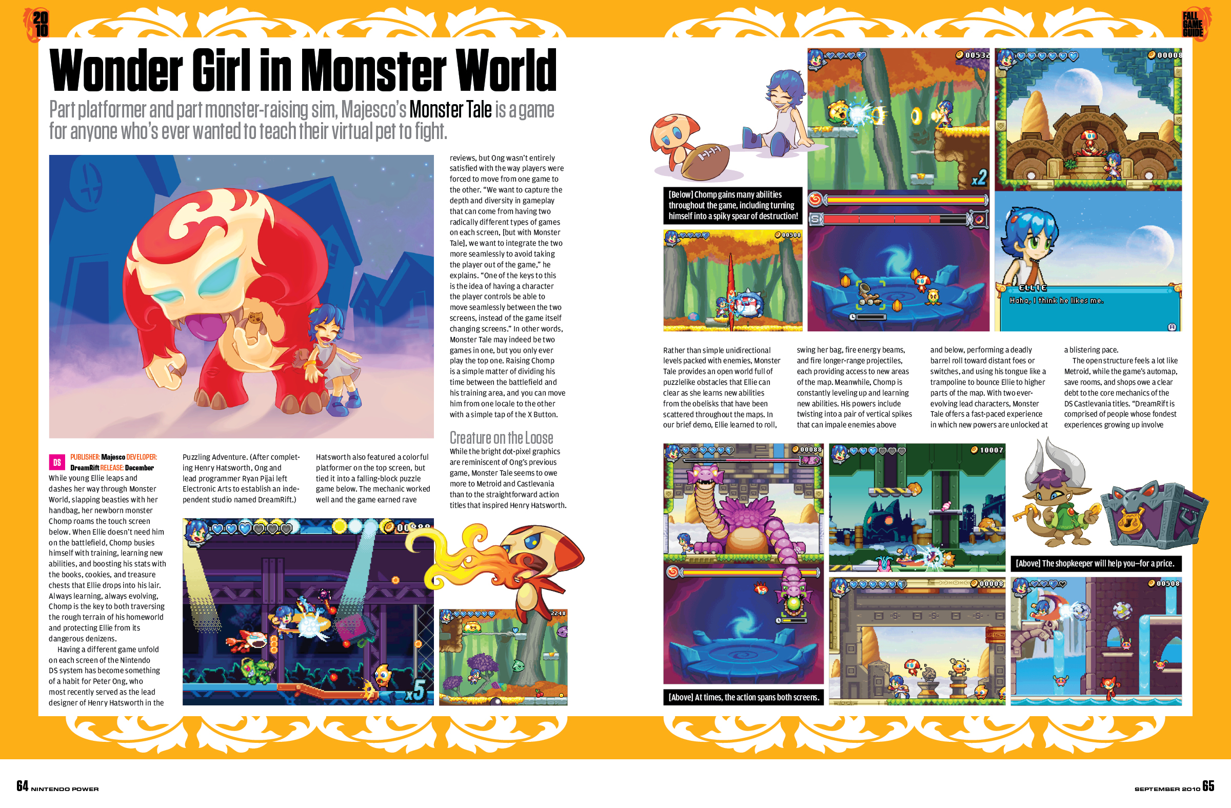 “We want to capture the depth and diversity in gameplay that can come from having two radically different types of games on each screen, [but with Monster Tale] we want to integrate the two more seamlessly to avoid taking the player out of the game. One of the keys to this is having a character the player controls be able to move seamlessly between the two screens, instead of the game itself changing screens.” – Peter Ong. DreamRift/Monster Tale developer