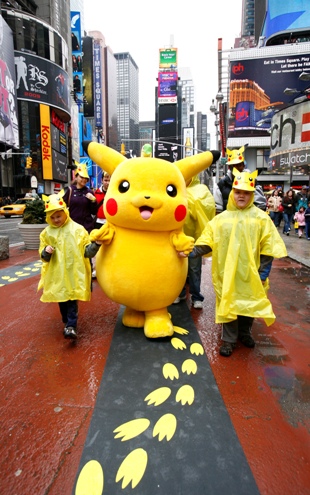 NEW YORK, March 14, 2010 – Celebrating the launch of the Pokémon HeartGold Version and Pokémon SoulSilver Version video games for the Nintendo DS system, brothers Adrian and Damian K. from New York join beloved Pokémon, Pikachu, on a walk in Times Square. The games come with the Pokéwalker accessory, a special pedometer that lets players take their favorite Pokémon with them wherever they go. (Anders Krusberg for Nintendo)
