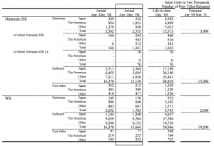 The nine month figures for net sales, operating income, ordinary income, and net income represented the third best corresponding performances in company history, but they all saw a decline from the results of the prior year. The net sales and operating income declines in comparison to the record-breaking previous year primarily stem from year-on-year decreases in Wii hardware and Nintendo DS software sales, a price cut for Wii hardware, and the significant impact of a stronger yen.