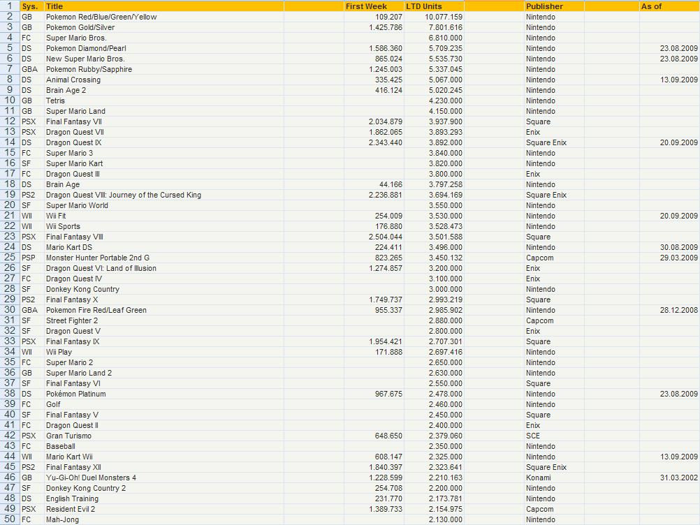 A list of the top 50 (well, 49 technically) best-selling Japanese games of all time has been compiled. The classic Pokemon Red/Blue/Green/Yellow titles stand at the top of the list with over 10 million units sold. Meanwhile, the recently released Dragon Quest IX is already within the top 15. You can check out the full list in the image attached to this post above.