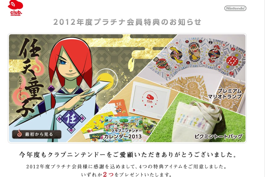 Japan’s Club Nintendo platinum rewards were announced today. The downloadable game Nintendouji, a set of Mario playing cards, a Pikmin tote bag, and Club Nintendo 2013 calendar are among the prizes.