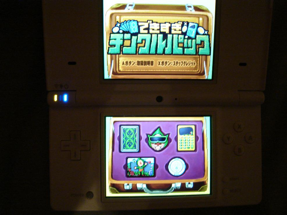 – Tarot card fortune teller (predicts love/financial fortune), timer, calculator, music application (Tingle dances in front of DSi picture), coin mini-game (20 players)