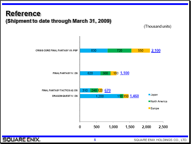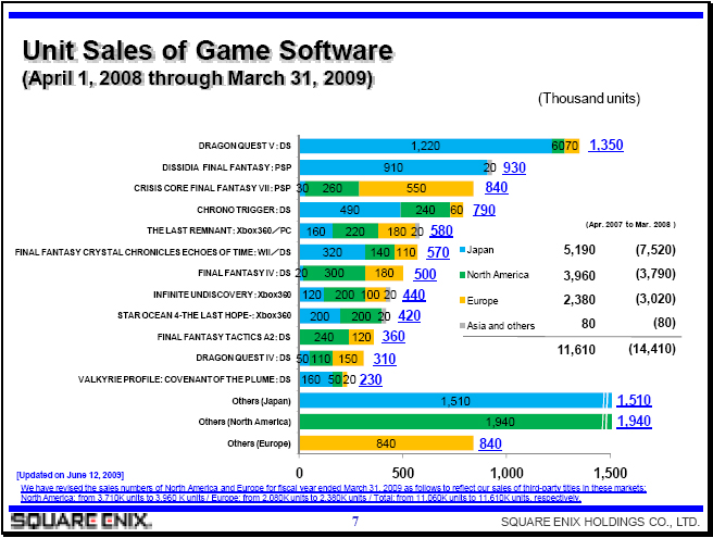 Today, Square Enix finally released the “North American version” of their latest financial results for the fiscal year. Now all of the charts and sales figures can be read in English. These numbers are in the thousands units and account for data ending March 31, 2009.