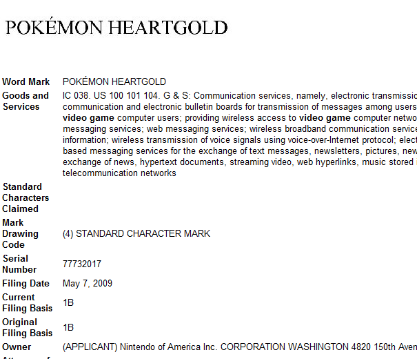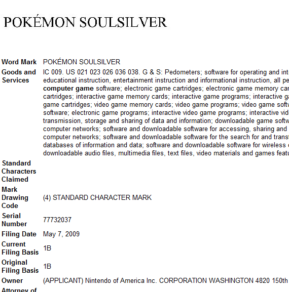 As if it was any surprise, Pokemon Heart Gold and Soul Silver have been registered in the US Patent and Trademark database. Both titles were added prior to the official announcement, so it’s possible that Nintendo is hoping to launch the products in North America not too long after they become available in Japan. Perhaps the company will be featuring the games at E3 this year.
