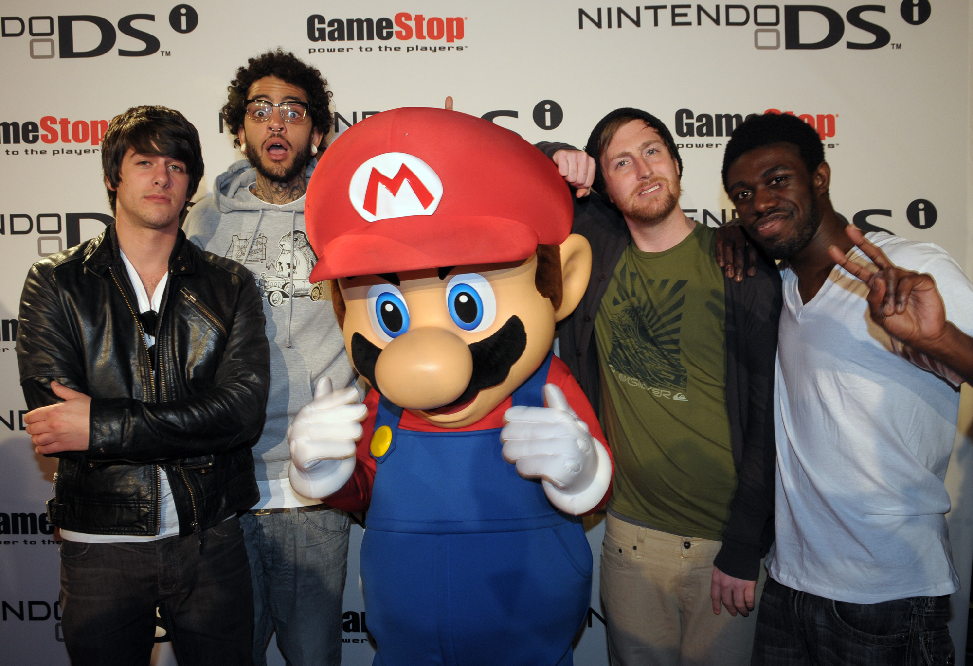 In this photo released by Nintendo, Gym Class Heroes band members pose with video game icon Mario after they performed at the Nintendo DSi launch event at GameStop at Universal CityWalk, Sunday, April 5, 2009 in Los Angeles, Calif. (Nintendo photo by Bob Riha, Jr.)