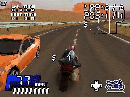 The perilous world of street racing is about to get a whole lot more exciting with the release of Powerbike! When an anonymous sponsor offers the resources to compete with the best street racers in the world, the only thing left to do is jump on your bike and show everyone who is boss. Speed through dangerous streets and jump trains, bridges and traffic congestion while fleeing from the cops on eight challenging courses across the desert, city, shipyard and more. Riders can earn even more cash by performing jumps, burnouts, wheelies and drifts in Stunt Mode. Go head-to-head with friends via local DS multiplayer in both Race and Stunt Mode, and use your hard earned cash to upgrade your bike’s speed, acceleration, traction and stability in three different difficulty modes.