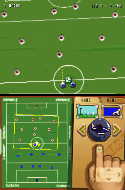 Italian game developer ARTEMATICA has faithfully recreated the original tabletop football game on the Nintendo handheld, making full use of the Dual Screen functionality. Gamers interact with the game using the stylus on the lower screen to set the player position, defend, attack, pass and shoot, with full control over ball. Using the finger-flick icon on the screen, the player can choose the angle and power of the kick just like the real thing. The upper screen gives real time feedback on all the match action with fouls, goals and even those all-important aerobatic shots.