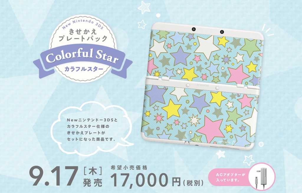 Nintendo is bringing another New 3DS cover plate bundle to Japan next month. On September 17, consumers can pick up the package containing the standard New 3DS, “Colorful Star” cover plates, AC adapter, and 4GB microSD card. Pricing is set at 17,000 yen.