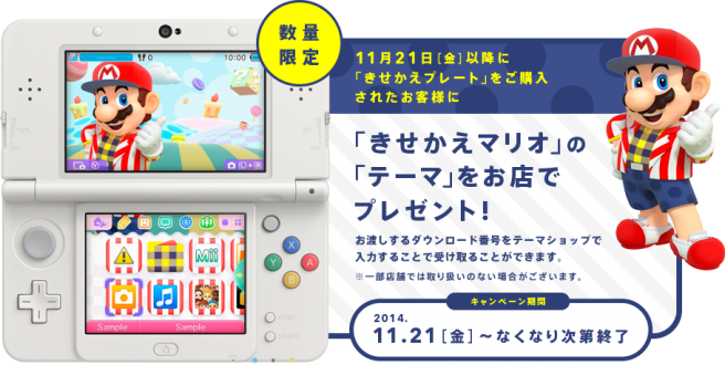 Those who purchase the Kawaii Kisekae New 3DS cover plate in Japan will receive a free theme. Consumers will be able to add a Mario theme to their system, which is pictured above. The Kawaii Kisekae cover plate will be available in Japan later this month.