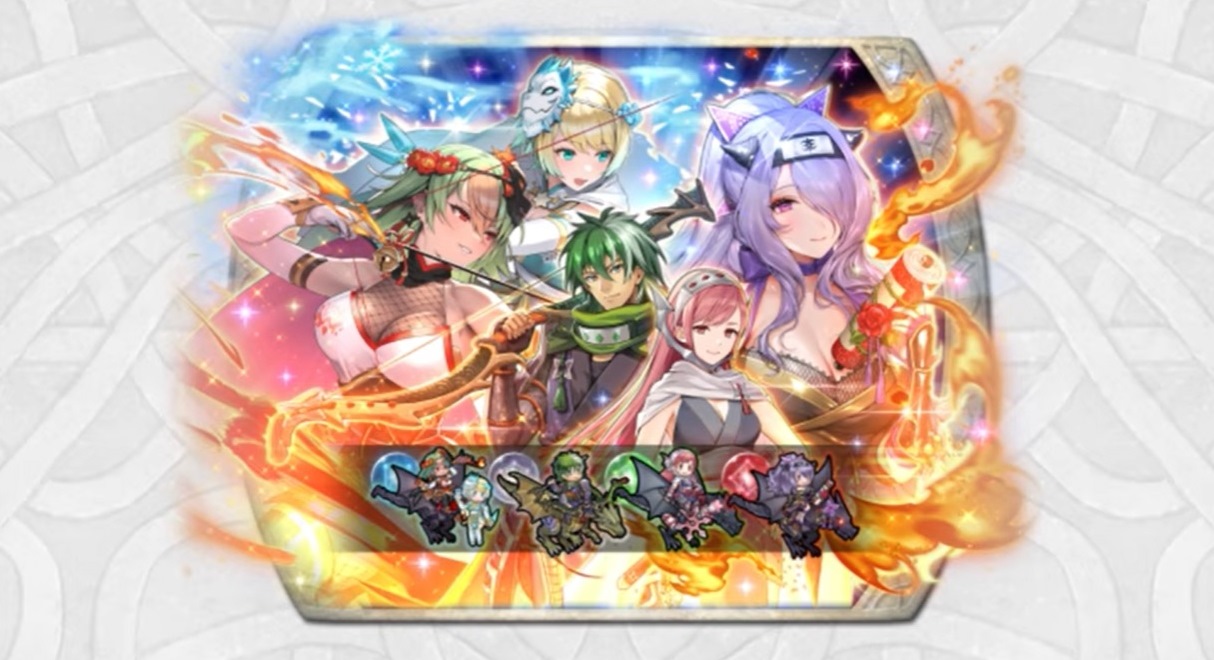 The lineup will feature Camilla: Midnight Doom (voiced by Misty Lee, art by Sencha), Cherche: Shaded by Wings (voiced by Amanda Miller, art by kaya8), Heath: Wyvern Ninja (voiced by Nathaniel Lane, art by motsutsu), and Laegjarn: Flame and Frost as a duo (voiced by Abby Trott + Heather Hogan, art by cuboon). Camilla has the learnable skills Flowery Scroll, Glimmer, Close Salvo, Seal Res 4, and Atk/Res Hold. Cherche can use Wyvern Ono, Ignis, A/D Near Trace 3, and Atk/Def Hold. The skills for Heath are Wyvern Yumi+, Bonfire, Atk/Def Catch 3, and Pulse Smoke 3. Finally, the lineup for Laegjarn is Flamefrost Bow, Moonbow, Atk/Res Catch 4, Seal Def 4, and Atk Smoke 4.