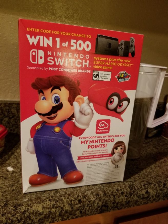 Earlier this month, Nintendo announced a partnership with Post cereals. Marked packages are offering consumers a chance to win one of 500 Switch Prize Packs, featuring a Switch system and Super Mario Odyssey.