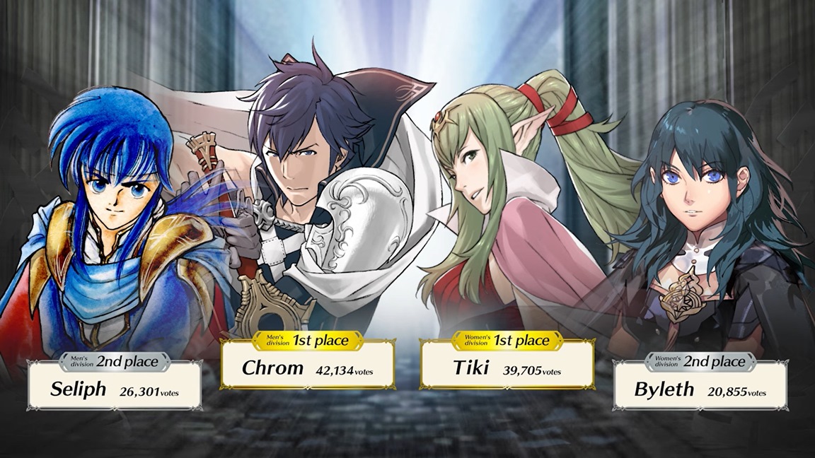 On the men’s side of things, Chrom (Fire Emblem Awakening) took first place with 42,134 votes followed by Seliph (Fire Emblem: Genealogy of the Holy War) in second with 26,301 votes. Tiki (Fire Emblem Awakening) was the number one choice for female characters with 39,705 followed by Byleth (Fire Emblem: Three Houses) in second at 20,855 votes. All of these characters will have Choose Your Legends versions in Fire Emblem Heroes this summer.