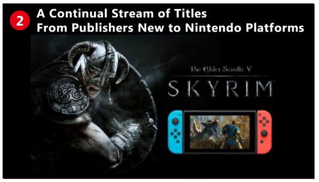 There are also titles being released by publishers who had previously not been seen on Nintendo platforms, such as The Elder Scrolls V: Skyrim from Bethesda Softworks. When these publishers release their titles for Nintendo Switch, their sales grow. Even for titles that were already available on other companies’ platforms, it seems that consumers are experiencing new ways to have fun when those titles are combined with the unique hardware features of Nintendo Switch. These publishers are preparing new ideas for consumers who purchased Nintendo Switch so they could enjoy these types of titles.