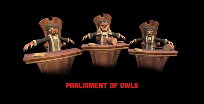 I should probably also mention that these owls are currently in what you’d call a “t-pose”, meaning they won’t have their arms awkwardly raised like that when you encounter them in the game. Rather, they’ll probably be doing something menacing like banging their gavel or hurling their wigs at you.”