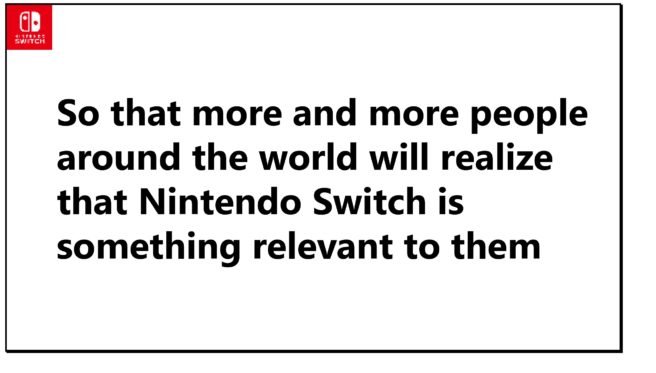 and other software publishers will release many new titles, including the ones that I will introduce shortly, that can convey the fun of playing Nintendo Switch to even more people. We will make efforts to bring the broader awareness of a variety of different entertainment experiences that the unique combination of Nintendo Switch hardware and a variety of different software can offer, not just among video game fans but even among people who have never before been interested in video games.