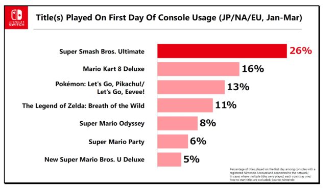 After the start of the calendar year, the title driving the most hardware sales is Super Smash Bros. Ultimate. This is a list of titles played by consumers on their first day after purchasing Nintendo Switch, between January and March 2019. As you can see, Super Smash Bros. Ultimate was the title most commonly played by users with new Nintendo Switch systems.