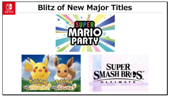 During October through December we will release a blitz of new Nintendo titles as shown. These new titles will offer fun for all of our consumers, from game fans to families, regardless of game experience or age. And all of these titles take advantage of the unique features of Nintendo Switch, enabling multiple people to enjoy exciting play together. These titles further enhance the allure of Nintendo Switch and will help make the system appealing to a wider range of consumers during the holiday season and beyond.