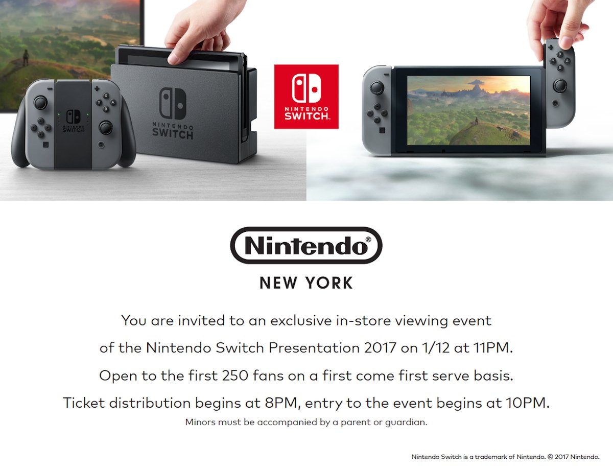 #NintendoNYC invites you to an in-store exclusive viewing event of the Nintendo Switch Presentation 2017 live from Tokyo on 1/12 @ 11PM. pic.twitter.com/DOe82tYRA9