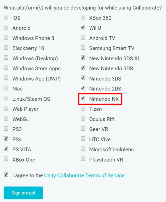 Over on the Unity Collaborate beta signup page, visitors have noticed that NX is included as one of the available platforms. It doesn’t confirm the engine’s support for Nintendo’s new console explicitly, but it is very likely.