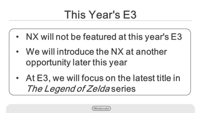 NX will not be featured at E3 2016 next month, according to the Wall Street Journal’s Takashi Mochizuki. He further reports that Nintendo will focus on Zelda at the expo.