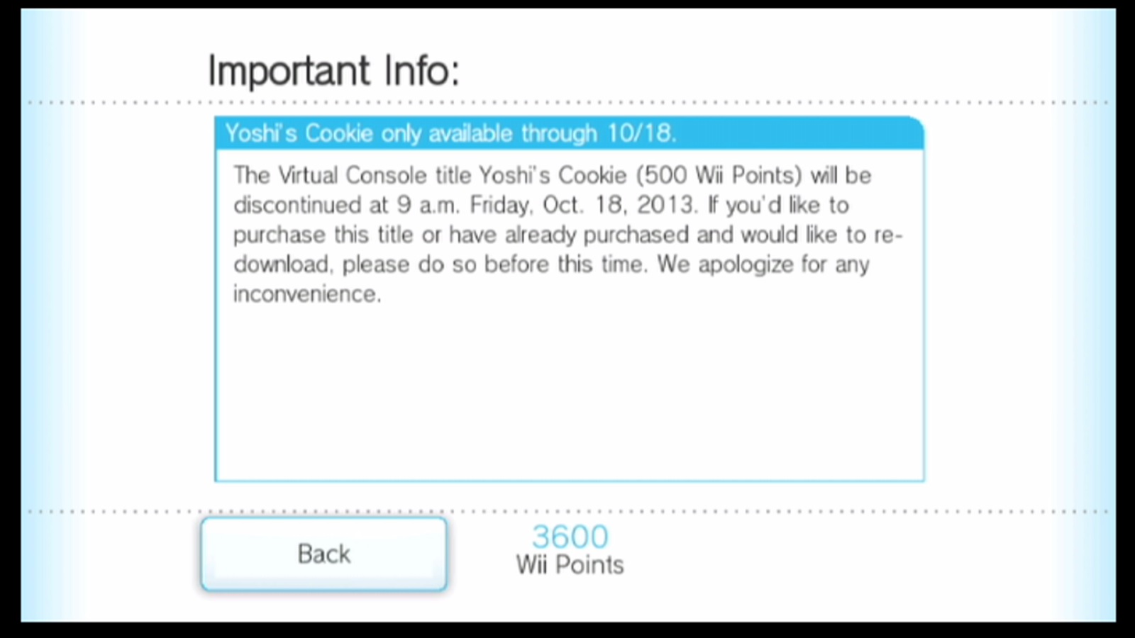 Nintendo will be removing Yoshi’s Cookie from the European Wii Shop Channel later this week, according to a message posted on the digital store. The Virtual Console game will no longer be available for purchase as of October 11.