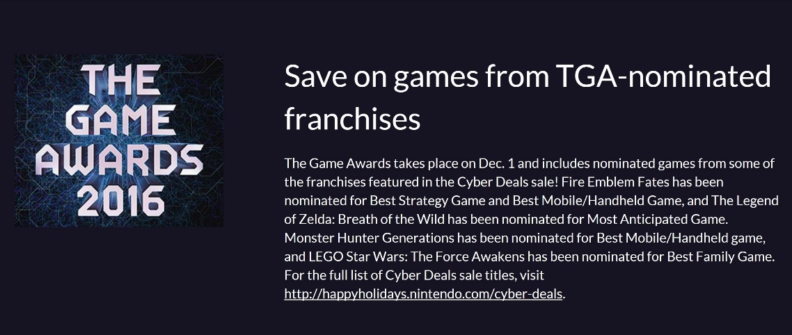 Nintendo’s website now shows The Game Awards “sale”. However, as you’ll quickly notice, it’s just piggybacking off of the new Cyber Deals that began last month. A bit disappointing to say the least!