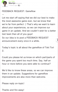 Give Two Tribes feedback on Toki Tori 2 for future update