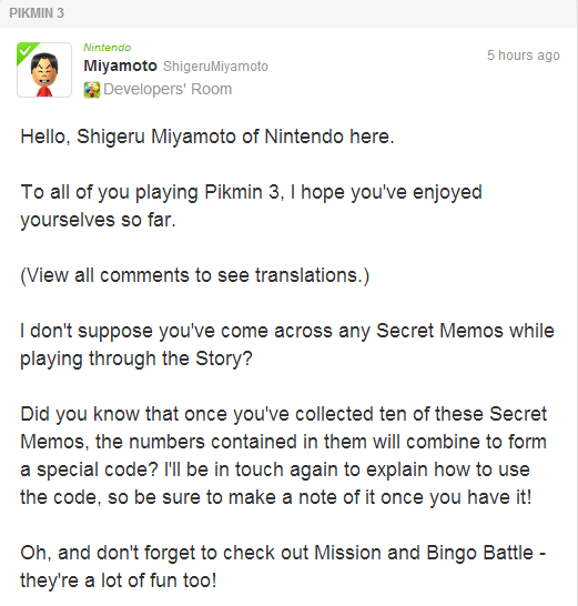 Those who are playing Pikmin 3 may come across a number of “secret memos” scattered throughout the single-player experience. A message posted by Shigeru Miyamoto on Miiverse confirms that ten exist, and the lot can be put together to form a code.