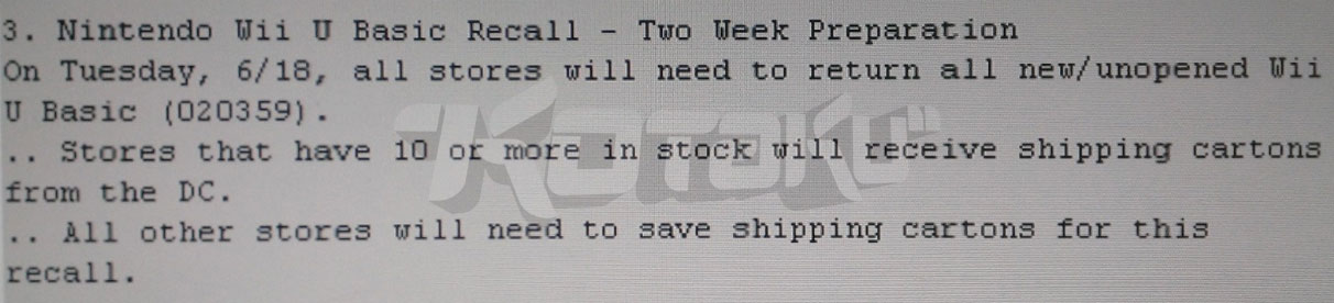 “Nintendo Wii U Basic Recall – Two Week Preparation On Tuesday, 6/18, all stories will need to return all new/unopened Wii U Basic (020359). .. Stores that have 10 or more in stock will receive shipping cartons from the [distribution center]. .. All other stores will need to save shipping cartons for this recall.”