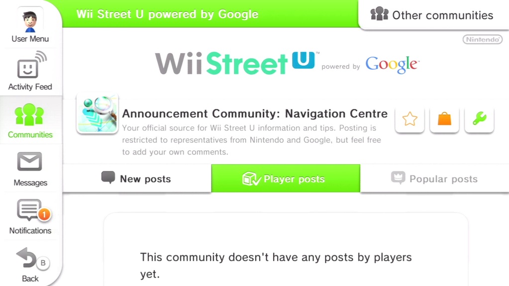 Visit Miiverse and you’ll come across a new community. Nintendo has added in the “Navigation Center” – home to the “official source for Wii Street U information and tips.” Only Nintendo and Google can make new posts in the community.