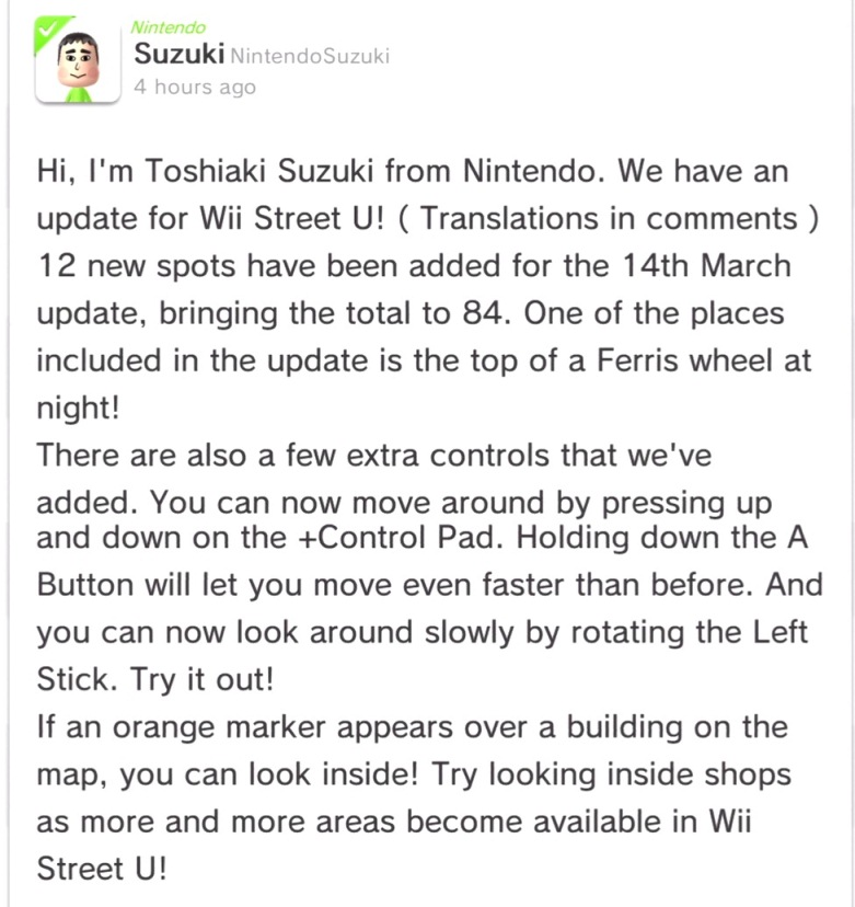 A new update has arrived for Wii Street U. Nintendo developer Toshiaki Suzuki posted a message on Miiverse confirming the addition of 12 new spots and control options.