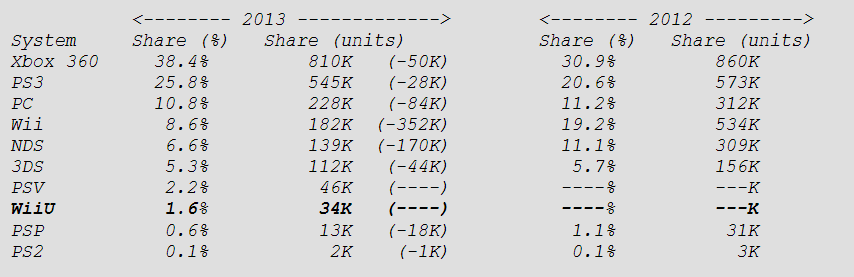 UK software sales for Wii U last month were rather abysmal. Just 34,000 games were sold in the territory throughout January. The figure is even more bewildering when you consider that all copies of Nintendo Land – yes, the ones bundled in with the Premium Pack – count towards the total. Wii U maintained a market share of just 1.6% in the UK.