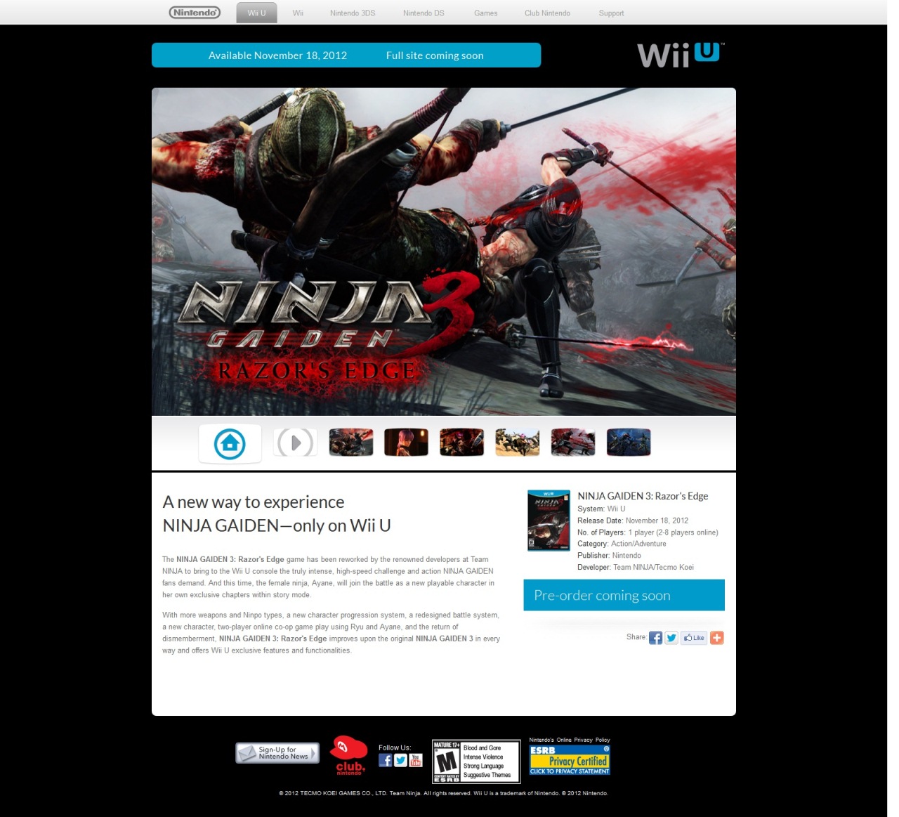 Nintendo has opened a teaser site for a third Wii U game that is set to come out on launch. You can take a look at the official page for Ninja Gaiden 3: Razor’s Edge here.