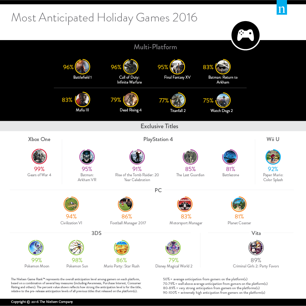 “Nielsen Game Rank represents the overall anticipation level among gamers on each platform, based on a combination of several key measures (including awareness, purchase interest, consumer rating and others). The percent value shown reflects how strong the overall anticipation level is for the title, relative to the pre-release anticipation levels of all previous titles that released on the platform(s). Values shown for multi-platform titles are averages of the values from each release platform. Titles included are those being released between Oct. 1, 2016 – Dec. 31, 2016, that have a Game Rank of 75% or higher. Data was collected by surveying 6,000 gamers age 7 to 54 between Aug. 21, 2016 – Sept. 24, 2016.”