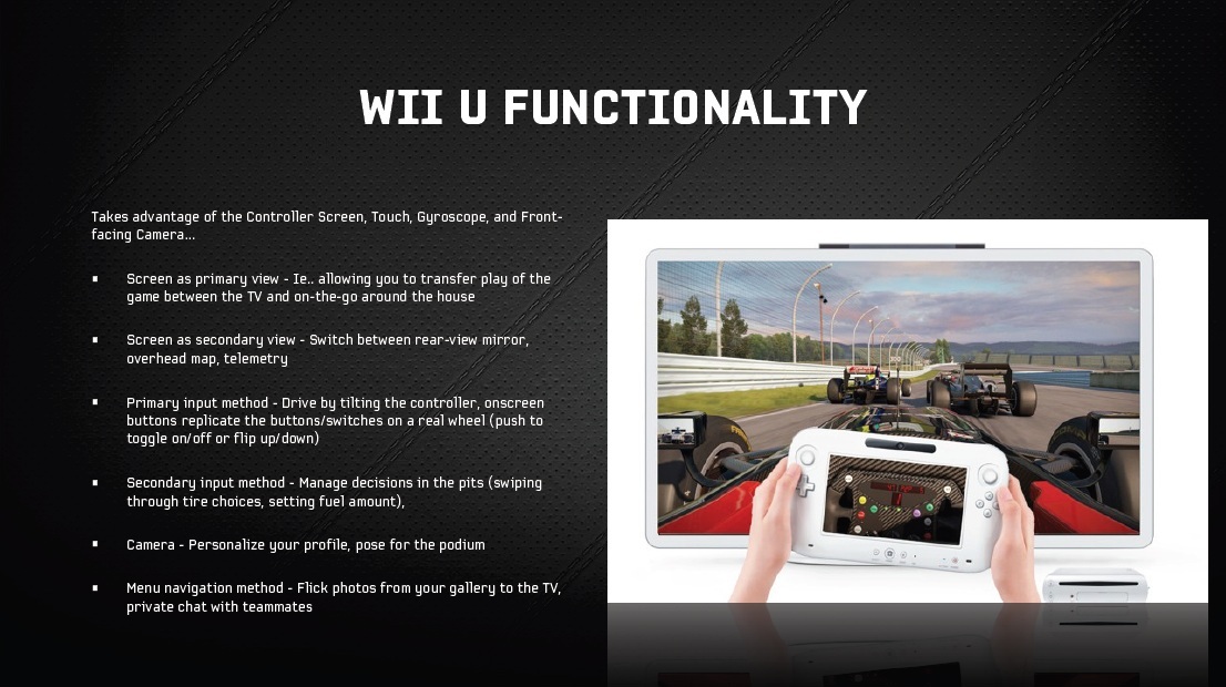 In any case, we have an absolute confirmation that Project Cars has been in development for Wii U. It’s mentioned numerous times in the company’s “overview” report created back in February. Better yet, it contains some information as to how the title will play like on the new console.