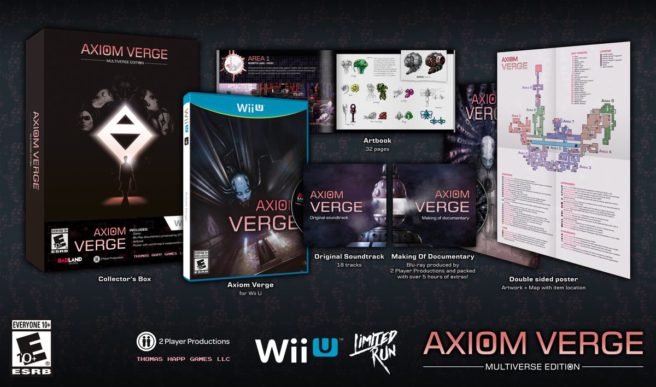 Axiom Verge comes with a few extra goodies. Aside from the game, you’ll receive a double-sided poster, “The Art of Axiom Verge” art booklet, an exclusive “Making Of” documentary Blu-ray, and an original soundtrack on physical CD.