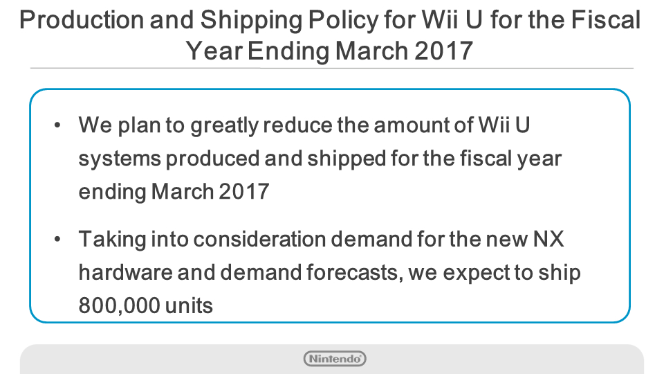 Next, I would like to discuss our strategy for production and shipping of Wii U in the fiscal year ending March 2017. We plan to greatly reduce the amount of Wii U systems produced and shipped for the fiscal year ending March 2017, compared to the fiscal year ended March 2016.