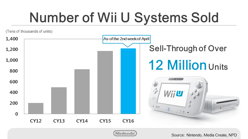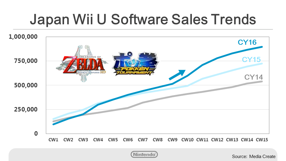 Although this installed base is not as large as we have seen with past home consoles, we had a major hit in 2015 with Splatoon, and we have continued to sell units in Japan.This graph shows the Wii U software sell-through in Japan from the start of the year through last week, compared with the same period over the last two years. Splatoon has continued to sell well since the start of the calendar year, and we launched The Legend of Zelda: Twilight Princess HD on March 10th and Pokkén Tournament on March 18th, spurring higher sales in this period than in the same period in the last two years.