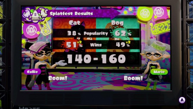 It’s 12 AM PT / 3 AM ET, so the first Splatfest in Splatoon should now be live in North America. This first event pits cats against dogs. You’ll have until 12 AM PT / 3 AM PT on Sunday to participate.