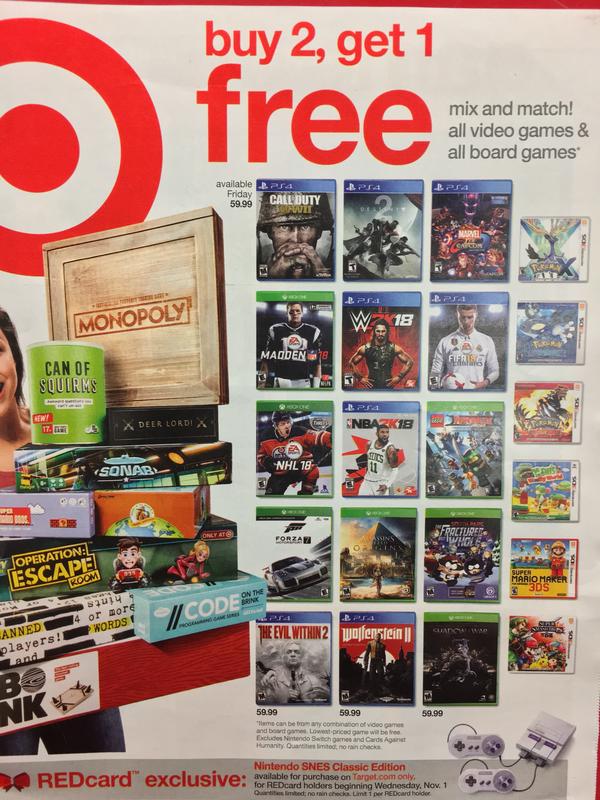 Target’s sale officially starts on October 29. Almost every game is eligible – except for Switch. None of the console’s titles will be included. On the bright side, 3DS will be represented here, and presumably Wii U as well. An early flier highlights Pokemon, Super Mario Maker, and Smash Bros.