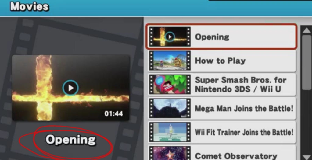 Super Smash Bros. for 3DS did not have an opening movie. The Wii U version, however, will in fact include one. This was confirmed during today’s Smash Bros. Wii U presentation – check out the screengrab above.
