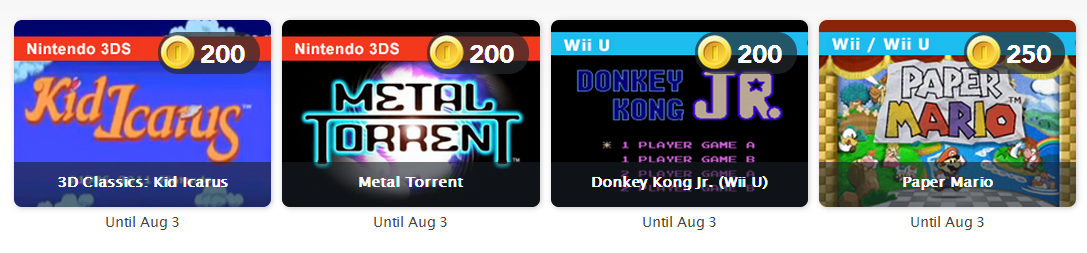 This month’s digital rewards on Club Nintendo have gone live. Members can choose from Kid Icarus (3DS, 200 coins), Metal Torrent (3DS, 200 coins), Donkey Kong Jr. (Wii U, 200 coins), and Paper Mario (Wii/Wii U, 250 coins). These items last through August 3.