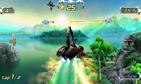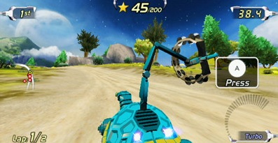 “The original Excite Truck stood out from the crowd because of the unlikeliness of trying crazy tricks with regular trucks that you might see every day. This time, we’re bringing every more insane stunts and tricks. However, when we raced the new tracks with the trucks, we felt that the two elements didn’t match up quite as well as we hoped, and we couldn’t get immersed int he game like we wanted to. So, we really wanted to create an offbeat, unconventional design that no one would find anywhere else and would fit with the wacky action. That’s how we came up with the robot critters.” – Excitebots developers